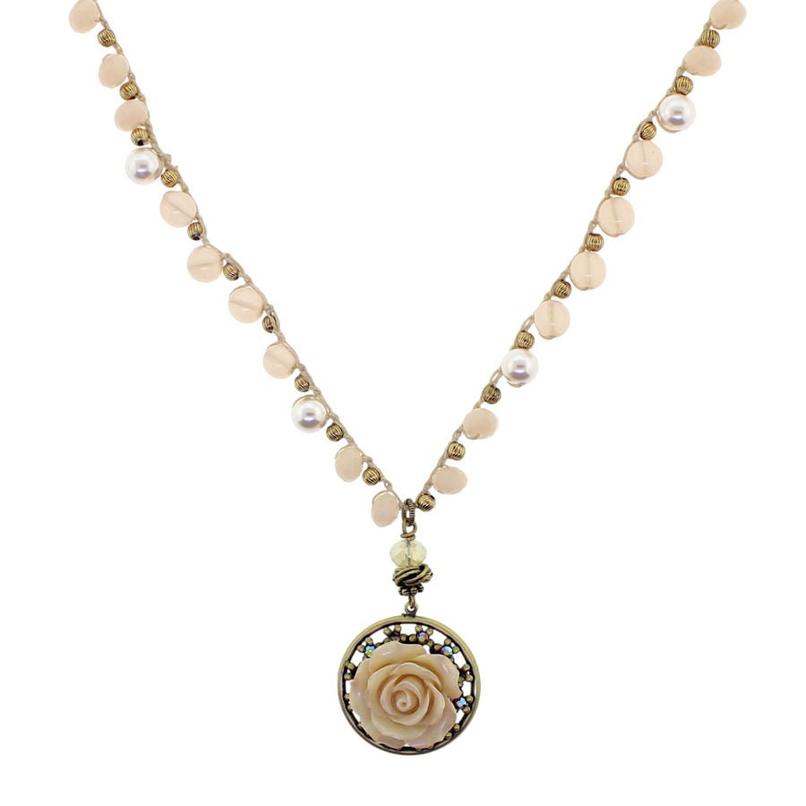 • Shabby stained ivory color rose flower is set inside a border of starlight crystal on a filigree pendant which complements the beads, offering a romantic, summery mood. Designed and made in our Los Angeles studio.